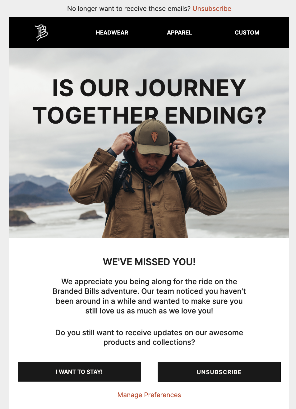 This may sound counterintuitive, but removing contacts from your list who are no longer engaging with your content will improve your overall email health. Post-BFCM is the best time to evaluate contacts for suppression - if a subscriber did not engage during the biggest promo of the year, it's unlikely they'll continue to engage with your brand overall. You'll want to start by looking for contacts that have been on your list for a while, and narrow down by ones that haven't purchased, visited your site or engaged with emails in a year. Send them a message asking if they'd still like to hear from you (you can include an incentive to grab a little extra inbox attention, too). Anyone who doesn't engage with this type of campaign can either be pulled into an unengaged segment to exclude from campaign sends, or can be fully suppressed from your list. Remember - if they want to hear from you they can always sign up again!