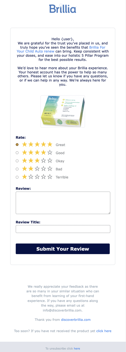 Nobody makes a better advocate for your products and your brand than a happy customer! Time your review requests to arrive shortly after the product has been delivered, once the customer has had a chance to use it a bit but while it’s still fresh on their mind.